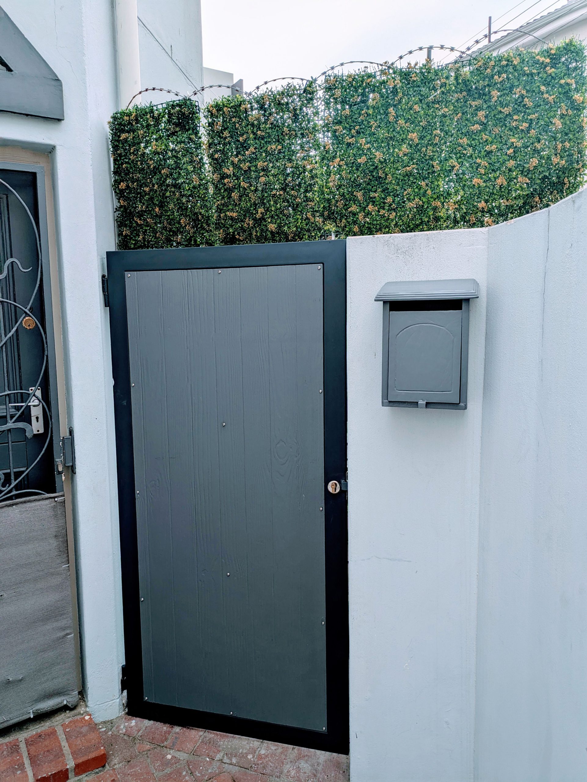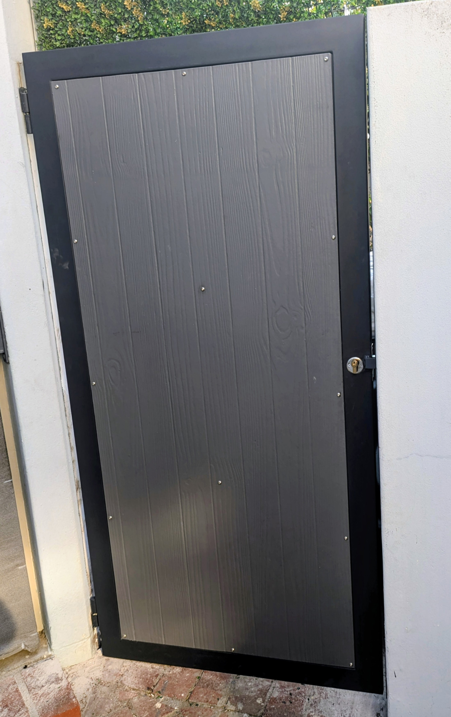 The gate was fabricated from durable steel and finished with Nutec boards, selected for their strength, low maintenance, and modern appeal. To ensure complete harmony with the property, the gate was paint-matched to the existing house, while the lock, hinges, and hardware were handpicked to achieve both security and aesthetic consistency.